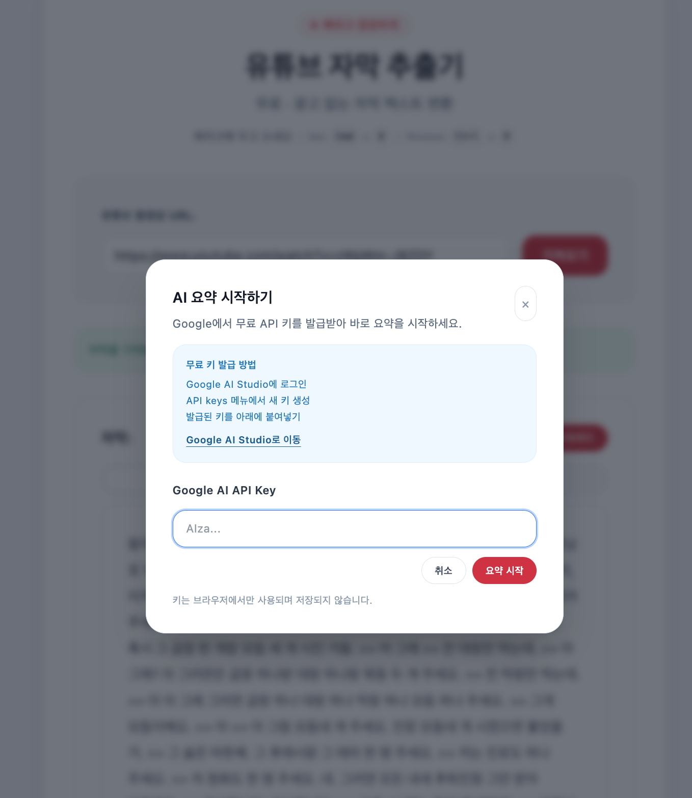 - 무료 API 키를 발급받는 방법을 안내하는 모달을 띄운다